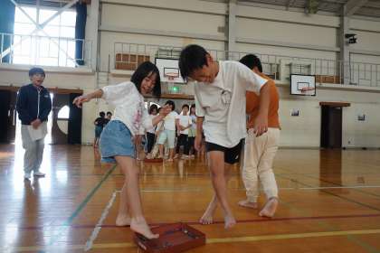 大小のビー玉がたくさん入った容器から足でビー玉をつかみ、けんけんをして少し離れたところにある箱にビー玉を入れます。3年生にとっては、初めてのチャレンジでしたが、子どもたちは楽しみながら普段の足育の成果を発揮していました。