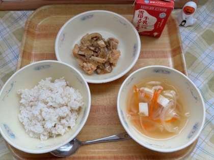 31日(木)の給食は、麦ごはん・牛乳・鶏肉のきのこごま甘酢あんかけ・とうふのスープでした。