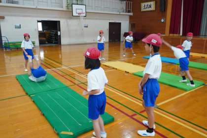 技に挑戦することを通して、マット運動のおもしろさ(体を操ること、くるんと回ってぴたっととまること、バランスをとって回ることなど)に気づいてほしいと思います。
