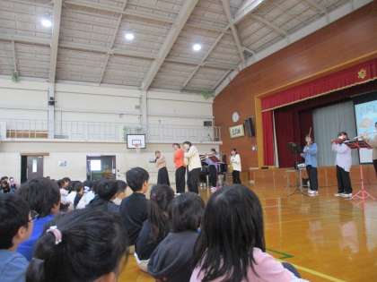 13日(水)に文化芸術鑑賞・体験がありました。今年度は『どれみふぁそったくん』という音楽グループのお兄さんやお姉さんに来ていただきました。