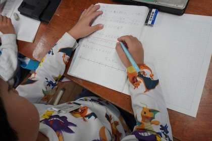 3年1組は、先週の金曜日に「間の数」の学習をしました。最初の問題は「木を7本1列にうえます。木は2mずつはなれています。両端の木の間は何mですか」でした。式が2×7と2×6に分かれたので、図をかきながら「間の数は木の本数よりも1つ少ない」ことを考えました。