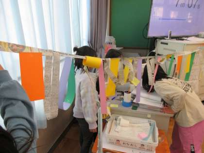 教室内を細長く切った新聞紙や画用紙で、自由につないだりつるしたりして、造形遊びを楽しみました。つないだりつるしたりする方法がたくさんでてきて、とてもワクワクする学習になりました。