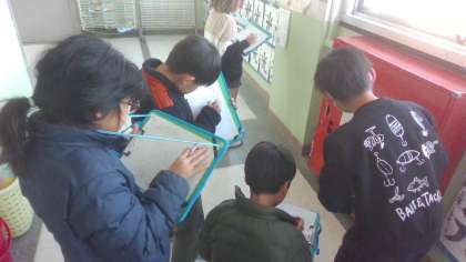 今週は身の回りにはどのような消防設備があるのかを調べるため、学校内を探検しました。