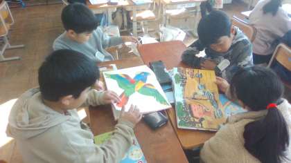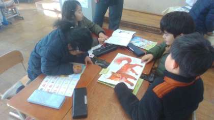 外国語活動は、最後の単元「Who are you?」が始まりました。最後の単元は教科書にある、お話のおおまかな内容をつかむとともに、単元の最後に図書館にある日本語の絵本の中からグループで1冊選んで、英語になおして、読み聞かせをすることになりました。