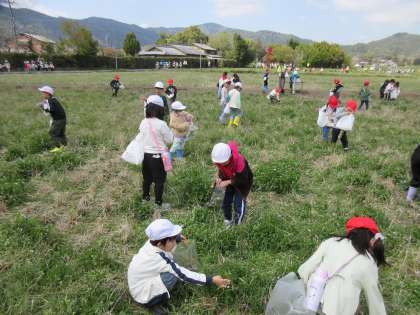 昨日は雨でしたが、今日は晴れました。昨年度とは違い、今年は2年生のお兄さんお姉さんとして1年生と一緒にれんげつみをしました。教室に戻ってから、摘んだれんげの絵をかきました。