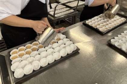 米粉と砂糖と水をよく混ぜ合わせて、さらに煮溶かした黒ざとうを加えて生地を作ります。生地ができたら、400個以上のカップに生地を注いでいきます。米粉は沈みやすいので、カップからこぼれないよう丁寧に、でも手早く注いでいく必要があります。生地を全部カップに入れられたら、スチームコンベクションオーブンでじっくり蒸して、できあがりです。
