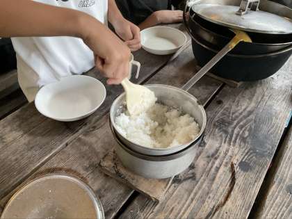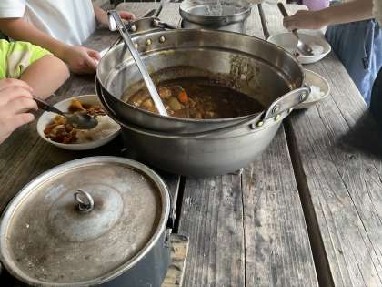 カレーライスが完成しました。どの班も、みんなで協力して作ったカレーライスです。きっと、「自分たちの班のカレーライスがいちばんおいしい」と言いいながら食べていることでしょう。ホームページの写真からも、おいしそうなにおいがただよってきそうですね。