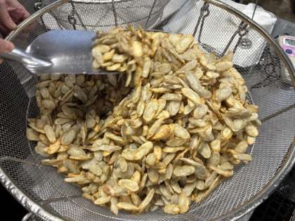 チキンチキンごぼうは、新献立です。山口県の学校給食の人気メニューを取り入れました。ごぼうと鶏肉に片栗粉を付けて揚げて、えだ豆を蒸して、しょうゆとさとうを合わせた甘辛いタレに絡めて仕上げました。「おいしい!」「また食べたい!」の声がたくさん聞けました。