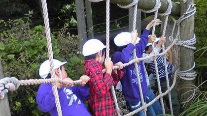 4日目、みんなが楽しみにしていた冒険の森です。本格的なフィールドアスレチックに興奮気味。普段は味わえないスリリングでワイルドな体験に歓声がひびきました。もっと時間がほしかった様子でした。
