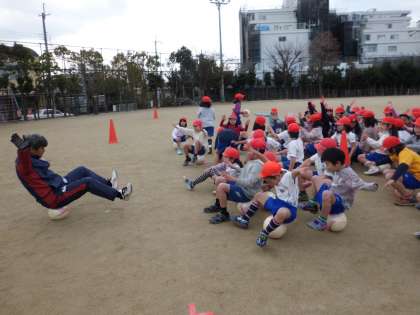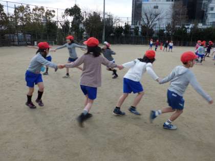 そのあとは,4人で手をつないだままの「おにごっこ」をしました。これは,友だちと速さや行く方向を合わせないとうまくいきません。自分勝手に走っていっては,すぐに手が離れてしまいます。友だちと手をつなぎ,歓声をあげながら走り回る子どもたちは,とても楽しそうでした。〜その2へつづく〜