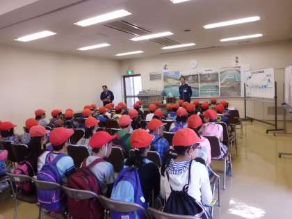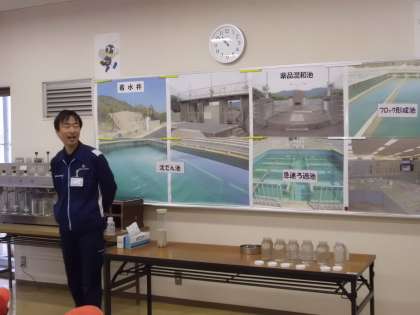 「新山科浄水場」では、琵琶湖から取り入れた水が安心して飲めるきれいな水になるまでの過程を、パネルを使った説明や実際の施設を見学して学習しました。