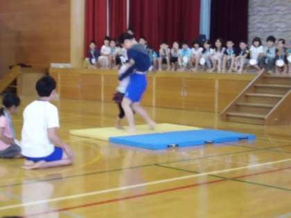 6年生に手をひかれて1年生が入場した後,児童会代表の「始めのことば」から会がスタートしました。1年生は自分の名前を呼ばれて,元気良く返事をしていました。次は,「比べっこ」です。1年生と6年生で色々なことを比べました。そして,1年生対6年生ですもうをとりました。6年生に全力でぶつかっていく1年生。6年生も一生懸命に応戦していましたが,そこはやはり体の大きさと経験がものを言い,6年生が勝ちました。