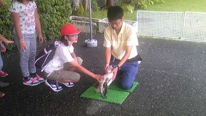 楽しみにしていたペンギンタッチです。一人ずつペンギンの背中側から近づいて優しくタッチしました。また、ペンギンの生態も詳しく説明していただきました。