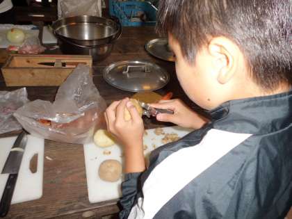 「みさきの家」以来(?)の野外炊事です。何が悲しいのか涙を流しながら玉ねぎを切っていました。じゃがいもはピーラーでスイスイでしたが、芽の処理が難しかった。ピーラーでもできるんですよと教えていただきました。