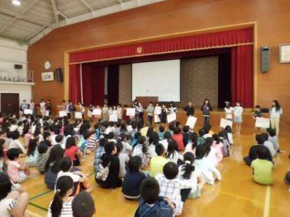 初めに児童集会です。今年度,児童会の中心となって頑張ってくれる計画委員さんと,各委員会の委員長さんの自己紹介の後,各クラスの代表による「クラス目標」の発表がありました。「こんなクラスにしたい」「今年1年頑張ろう」という思いの詰まった素敵な目標が並びました。目標のクラスになるために,一人一人がどんなことをすればよいのか,いろいろと考えながら学校生活を送ってくれるとうれしいです。