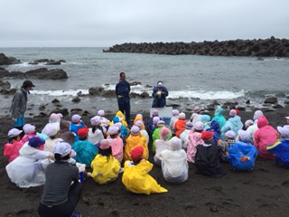 小雨の中でしたが、マリンランドの職員の方にお世話になりながら、海の生き物ヒトデの観察や、宮崎浜の潮溜まりにいる生き物の観察をしました。見つけたのは・・・。