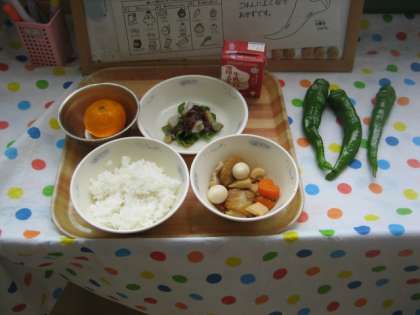 今日は,地産地消献立「平天の煮つけ」「京野菜のごまみそかけ」がおかずです。