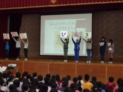 今日は,「素足・はだしが体に良いわけ」「つま先立ちの効果と約束」等の話を聞いた後,みんなでつま先立ちをしました。2分間はなかなかしんどいですが,みんな集中してがんばっていました。最後にみんなで広沢校の健康目標「広沢の子 こころも からだも たくましく」の合言葉を言って集会を終わりました。