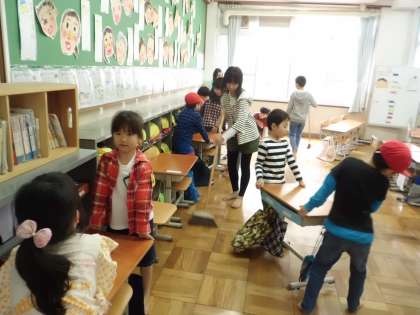気がつけばあっという間に5月です。どんどん学校にも慣れてきました。これまで,6年生が教室掃除をしてくれていましたが,少しずつお手伝いもしています。机運び!