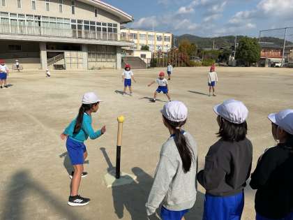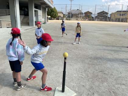 3年生の体育では「ハンドベースボール」が始まりました。足でするキックベースボールとは違い、ティーの上に置いたボールを手で打ちます。野球と同じダイヤモンドを走り、アウト、セーフもあります。