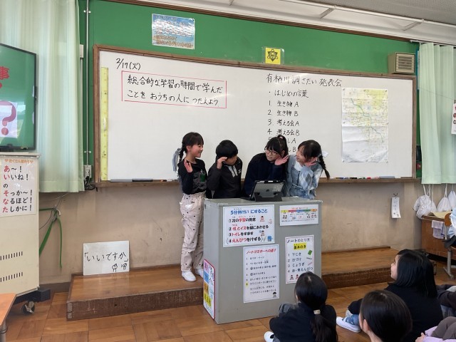 総合で学習した有栖川について、分かったことをパワーポイントにまとめて発表しました。