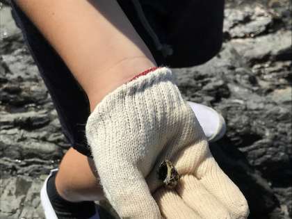 子どもたちは、慎重に岩場を歩きながら、磯の生き物を見つけています。ヤドカリ、カニ、アワビ、小さい魚…あちこちで歓声が上がっています。