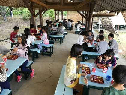 東屋でパンとおかずの朝食を美味しくいただきました。だんだん集団生活に慣れてきています。今日の活動も楽しみです。