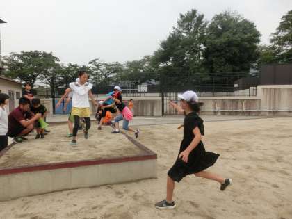 おにごっこは単純な遊びに見えて,走ったり曲がったり交わしたりと体をたくさん使います。子ども達は汗をたくさんかきながら楽しんで遊びに参加していました。