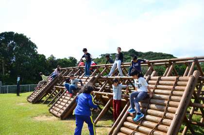 宮崎浜から帰り昼食を食べた後,時間に余裕がありましたので,30分ほどの自由時間がありました。60畳の部屋でゆっくり休む子ども,芝生広場で遊ぶ子ども,それぞれに過ごしました。