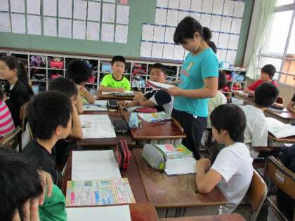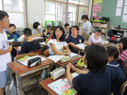 国語科では「学級討論会しよう」という単元を学習しています。一つの題に対して肯定・否定の立場を明確にして話し合い,考えを広げることをめあてとして意欲的に活動しています。この日のテーマは『自動販売機は必要かどうか』でした。「急いでいる時にもすぐに買うことができるので賛成です。」や,「電気代がもったいないのでいらないと思います。」など,根拠をはっきりと述べて討論が進められていました。