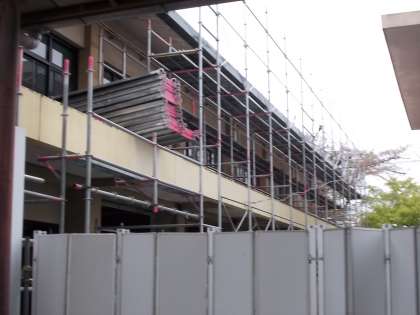 体育館の改修工事が始まりました。雨の中,たくさんの方が改修工事に携わっていただいていました。