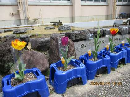 1年生の時に生活科の学習で植えたチューリップがきれいな花を咲かせました。入学式の時にも,みんなのチューリップが新1年生を迎えてくれていました。赤,ピンク,オレンジ,むらさき,様々な色で中庭がとても賑やかです。お花の中を覗いてみると・・・こんな形になっているのですね。
