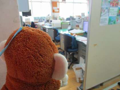 しょくいんしつは どんなへやなのかな。すこしのぞいてみると,つくえや ぱそこんが たくさんありました。せんせいたちも いっぱい いらっしゃいました。