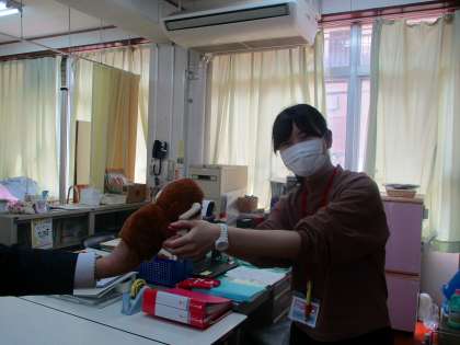 つぎに,ほけんしつに いきました。ほけんしつでは たなかせんせいが おしごとされていました。あくしゅをして あいさつをしました。