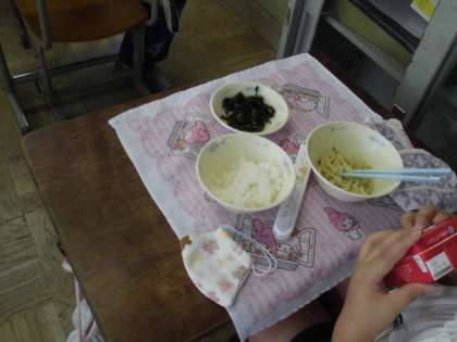 3か月ぶりの給食でした。給食当番や教室での台ふきやおぼんふきをみんなで協力して済ませ,久しぶりにおいしい給食を食べました。