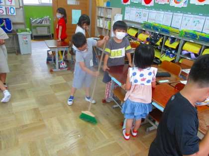 1年生のそうじは,教室やろうか,自分たちの靴箱が担当です。ほうきの使い方や机の運び方などを覚えながら,お友達と協力して頑張る様子が見られます。