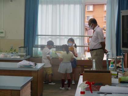 教室に帰ってきた子どもたちは,「理科室には,がいこつがいるんだよ。」「ふれあいホールには,コップがたくさんあったよ。」「校長室のソファに座らせてもらったよ。」と,大発見をたくさん教えてくれました。
