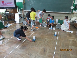 理科「ゴムや風の力」の学習で,送風機の風の力を使って車を走らせました。風の強さが弱い時と強い時の,車が走るきょりを比べました。風の強さが強いほど,車が走るきょりは長くなり,走る速さも速くなることが分かりました。