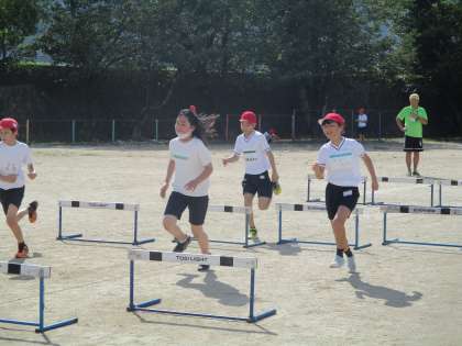先週から体育科の学習では,運動会に向けてハードル走の練習をしています。今日は,自分に合うインターバルを見つけました。5年生のときにも取り組んでいたので,上手にハードルを跳び越えることができていました。