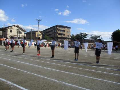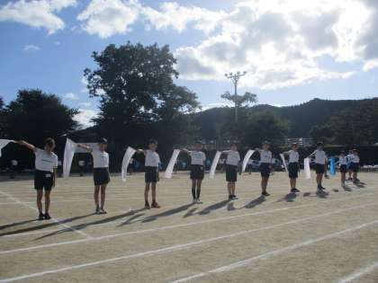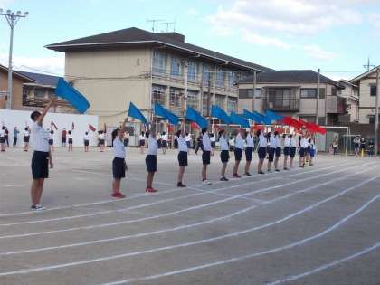 フラッグを使った集団行動も,いよいよ最後の見せ場です。みんなで大きな円を作り,順番にフラッグを上げていきました。