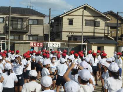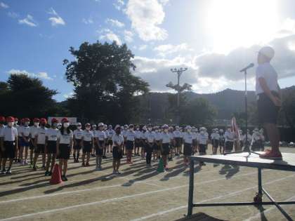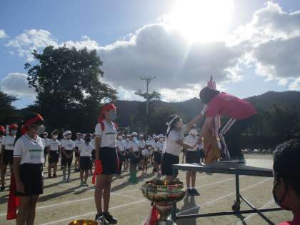 運動会最後の閉会式。今年度は,徒競走とアイデア走,ハードル走で赤組と白組が得点を競いました。わずか,6点差で今年度は白組が優勝しました!優勝は白組でしたが,赤組の人も,白組の人も,お互いのがんばりを称え合い,今年度の運動会がいい雰囲気で終了しました。