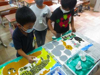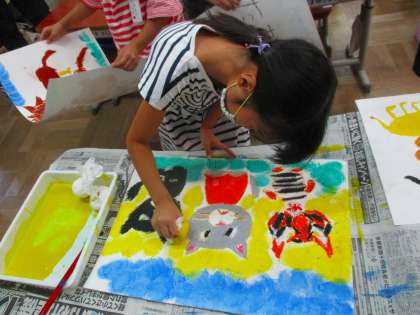 図画工作科で,お話を聞いて好きな場面を想像し,絵に表す学習をしています。「何をお話しているのかな。」「どんなことをしているのかな。」と考えながら絵を描きました。お気に入りの場面の絵ができあがりました。