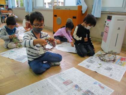「遠足で落ち葉やどんぐりを拾って,それをつけたらいいかも!」と意見が出たので,来週の遠足で,落ち葉やどんぐりを探してみることにしました。世界に一つのリースができ上がりそうですね。