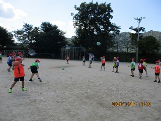 ボールの投げ方には,どんな投げ方があるのかと聞くと…「片手で投げます。」「両手で頭の上から投げます。」「バウンドをします。」など,たくさんの投げ方があることを確認しました。そして,2人組でパス練習をしました。これからの学習では,試合を通して,どのようにコートの中で動いたら点が入るかを考えていきます。