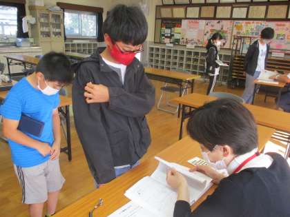 今日は,6年1組の第一回ノート検定でした。子どもたち同士で相談し合いながら,どのページを提示するかを決めている様子から,ノート検定を楽しみにしている気持ちが伝わってきました。