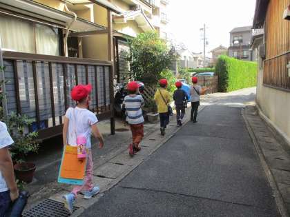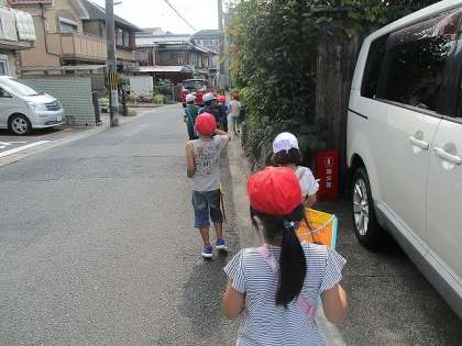 生活科の学習で「まちたんけん」に行きました。1学期に全員で校区を歩いて,もっと知りたいなと思ったお店や場所ごとにグループを作って,インタビューをしたり,まちの様子を見たりしに行きました。