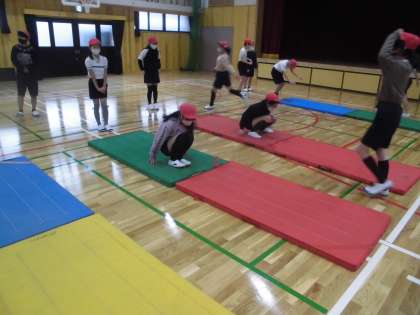 改装されて新しくなった体育館での学習ということで,気持ちよく取り組んでいる様子が見られます。学習の終わりには,どのような技ができるようになっているのか楽しみです。