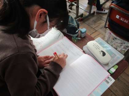 今日の授業では,いろいろな外国からの留学生の将来の夢とその理由を聞き取りました。そして,「I want to be a〜.」「I like 〜.」「I'm good at 〜.」など聞き取った表現を使いながら,自分の将来の夢やその理由を書きました。子どもたちは,これまで学習した単語や表現を使って理由を詳しく書こうとしていました。