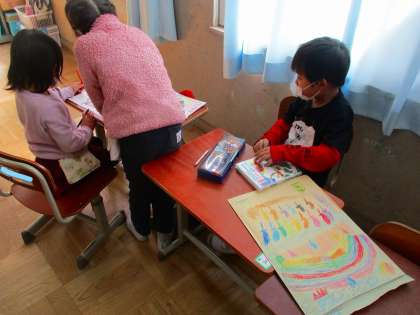 生活科で,年長さんに小学校のことを教えてあげる準備をしています。給食のこと,学習のこと,勉強のこと,友達のこと,登下校のことなどのグループに分かれて,小学校生活についていろいろなことをみんなで教えてあげようとがんばっています。