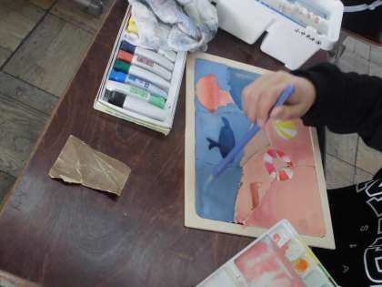 1ピースずつやすりをかけて,色をつけていきます。それぞれのピースに加え,枠ぶちや底板にも色をつけました。もうすぐ完成です。出来上がりが楽しみです。完成したら是非,お家で楽しんでくださいね。